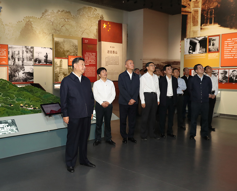 离开来青轩,习近平来到香山脚下的香山革命纪念馆,参观了《为新中国奠基——中共中央在北京香山》主题展览。新建成的纪念馆庄重大气,“四梁八柱”的雨棚造型寓意党中央在香山为新中国搭建四梁八柱。28根廊柱,象征中国共产党从建党到建立新中国28年的奋斗历程。南广场上矗立着高19.49米的国旗杆,寓意中华人民共和国诞生于1949年。主题展览由“进京‘赶考’”、“进驻香山”、“继续指挥解放全中国”、“新中国筹建”、“不忘初心、牢记使命、永远奋斗”5个部分组成,按历史脉络,通过800多张图片、报照、地图、表格和1200多件实物、文献和档案,全景式生动呈现中共中央在香山期间领导全国各族人民,完成民族独立和人民解放的历史使命、开启中国历史发展新纪元的光辉历程。