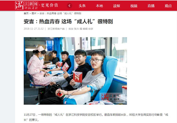 11月27日,一场特别的“成人礼”在浙江科技学院安吉校区举行。献血车前排起长队,00后大学生用实际行动彰显“成长”的意义。