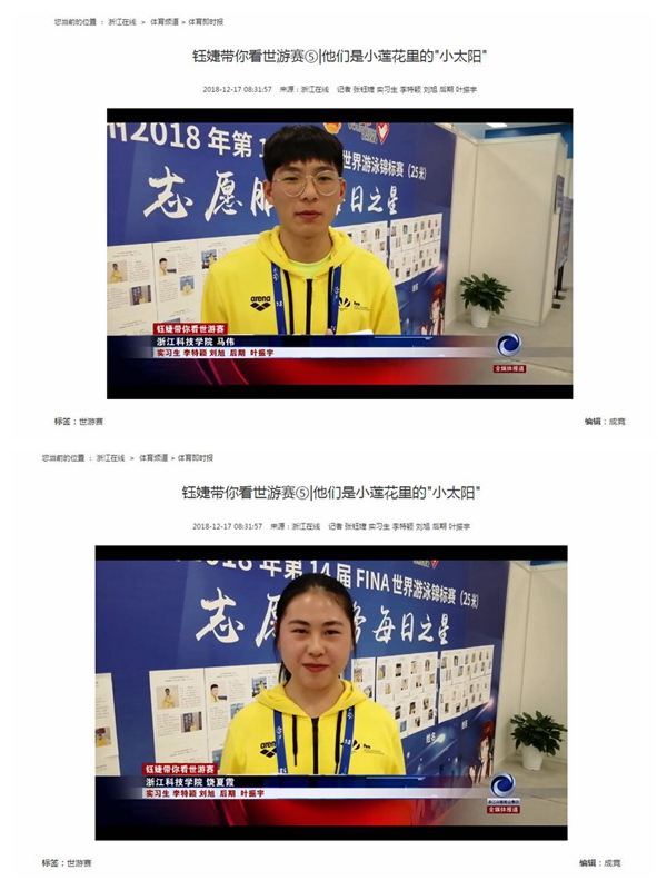 12月11-16日,第14届FINA世界游泳锦标赛(25米)在杭州举行,我校世游赛志愿者在岗服务期间,他们勇于担当、乐于奉献,用智慧和汗水践行了“奉献、友爱、互助、进步”的志愿者精神。服务期间,浙江在线对我校志愿者进行报道。