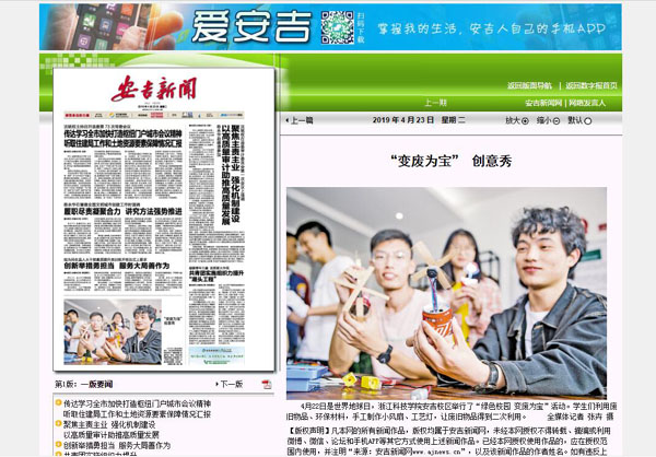 4月22日是世界地球日,浙江科技学院安吉校区举行了“绿色校园 变废为宝”活动。学生们利用废旧物品、环保材料,手工制作小风扇、工艺灯,让废旧物品得到二次利用。