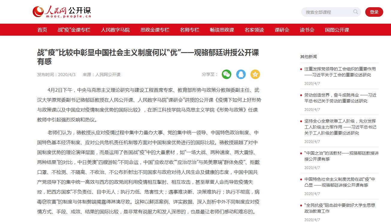 4月2日下午,中央马克思主义理论研究与建设工程首席专家、教育部形势与政策分教指委副主任、武汉大学原党委副书记骆郁廷教授在人民公开课、人民数字马院“课研会”讲授的公开课《疫情下如何上好形势与政策课以及中国应对疫情制度优势的国际比较》,在浙江科技学院马克思主义学院《形势与政策》任课教师中引起强烈反响和热议。