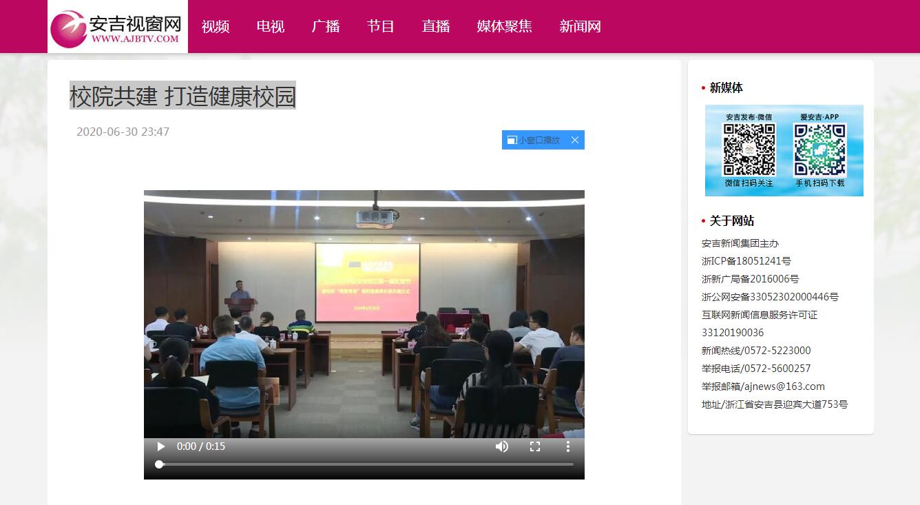 6月28日下午,安吉校区首届“我健康,我快乐”生活节(健康安全月)开幕暨校院“博爱青春”暖阳健康俱乐部共建启动仪式举行。安吉县媒体对活动进行了报道。