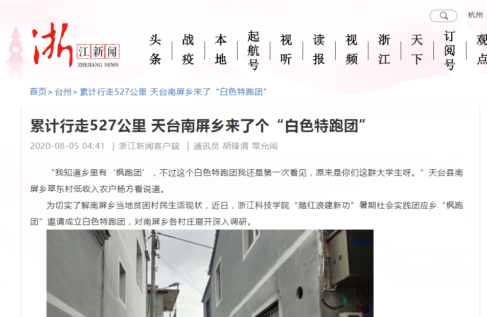 近日,应台州南屏乡“枫跑团”工作室邀请,浙江科技学院“踏红浪建新功”暑期实践团成立南屏乡“枫跑团”——白色特跑团,助力乡里的“最多跑一次”。