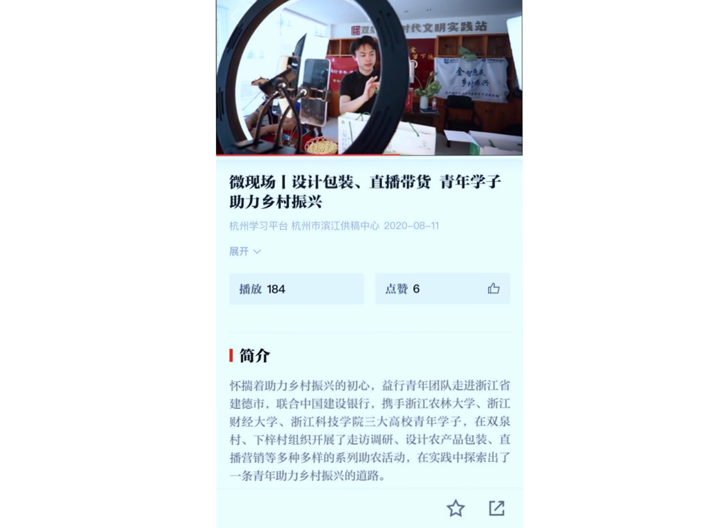 近日,学习强国和浙江在线等媒体关注我校青年学子暑期开展走访调研、设计农产品包装、直播营销等多种多样的系列助农活动,在实践中探索出了一条青年助力乡村振兴的道路。