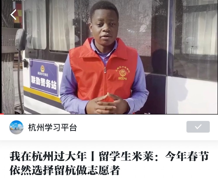 来自津巴布韦的留学生米莱,到杭州有四个年头了。人们经常会在西湖边,或者城站,看到这个小伙子的身影——有时忙着协助维持交通秩序,有时在为外国游客指路。今年春节,米莱依然选择留在中国。他和远在津巴布韦的家人说:“我很好,杭州很安全,你们不用担心。”同时,他也和家人们分享自己做志愿服务的照片。