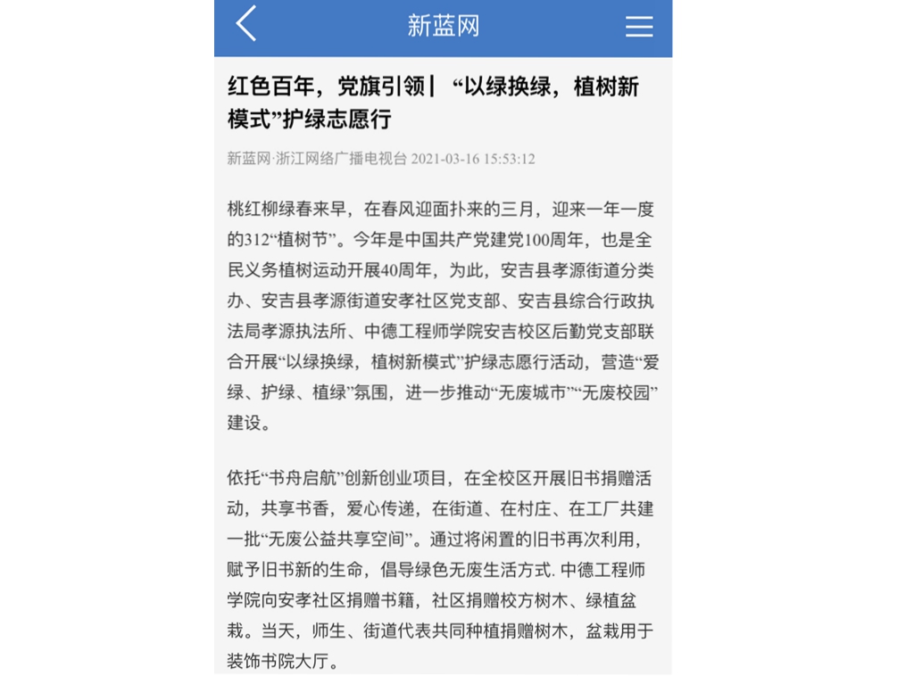 桃红柳绿春来早,在春风迎面扑来的三月,迎来一年一度的312“植树节”。今年是中国共产党建党100周年,也是全民义务植树运动开展40周年,为此,安吉县孝源街道分类办、安吉县孝源街道安孝社区党支部、安吉县综合行政执法局孝源执法所、中德工程师学院安吉校区后勤党支部联合开展“以绿换绿,植树新模式”护绿志愿行活动,营造“爱绿、护绿、植绿”氛围,进一步推动“无废城市”“无废校园”建设。