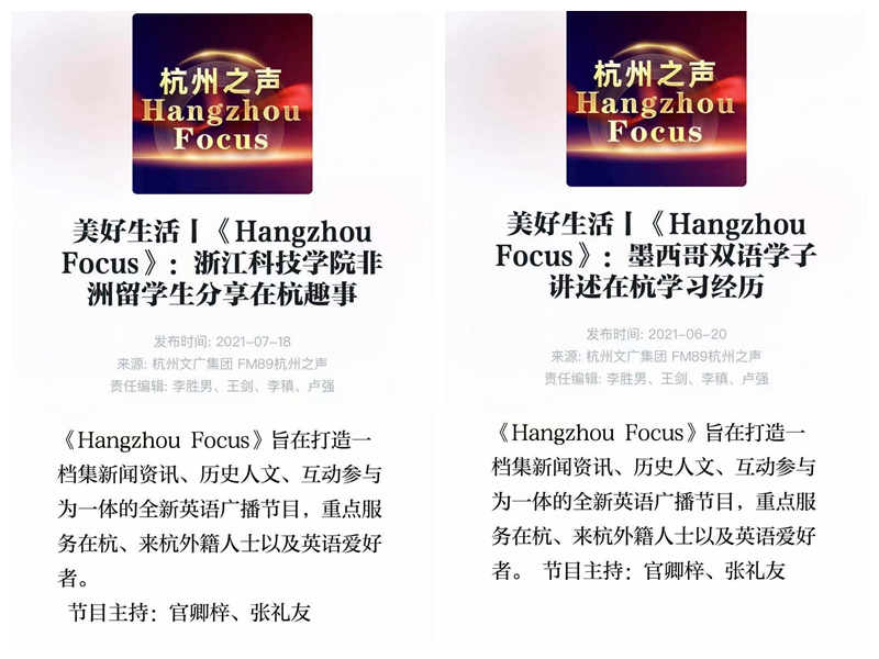 《Hangzhou Focus》旨在打造一档集新闻资讯、历史人文、互动参与为一体的全新英语广播节目,重点服务在杭、来杭外籍人士以及英语爱好者。近日,我校2位留学生受邀参加节目,讲述在杭学习生活经历。
