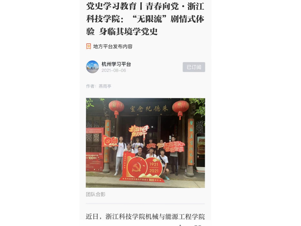 近日,浙江科技学院机械与能源工程学院志愿者协会暑期社会实践团队开展“无限流”剧情式党史学习体验,沿着中国共产党革命发展史的脉络,追寻红色足迹,找寻杭州红色记忆。