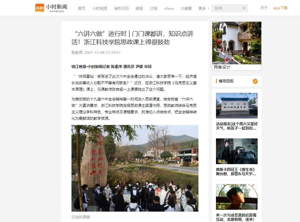 浙江是习近平新时代中国特色社会主义思想重要萌发地。为了讲好十九届六中全会精神,浙江科技学院思政课老师不断挖掘现实素材,运用好浙江改革实践的生动事例,进一步打造“行走课堂”。