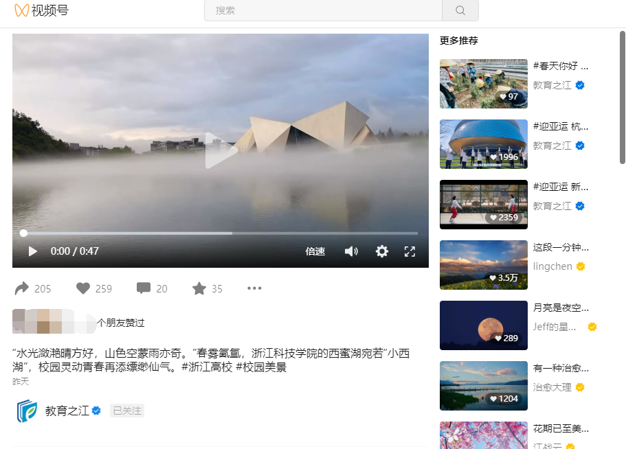 “水光潋滟晴方好,山色空蒙雨亦奇。”春雾氤氲,浙江科技学院的西蜜湖宛若“小西湖”,校园灵动青春再添缥缈仙气。#浙江高校 #校园美景