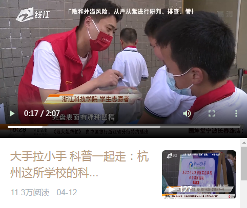 4月12日,理学院研究生党员志愿者前往浙江工业大学附属实验学校开展“双减”志愿活动。物理学专业的志愿者们发挥专业优势特长,通过物理实验演示等形式,拓展中小学生兴趣爱好,助力校园知识科普。