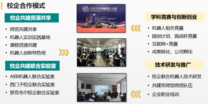 面向区域数字经济转型和机器人产业发展需要,机器人产业学院紧扣行业岗位群的能力要求,以培养创新实践能力为重点,基于“产出导向”和“持续改进”的工程教育理念,深化校企合作,校企共同制定培养方案,共同参与培养过程,共同评价培养质量,实现产教融合和协同育人。