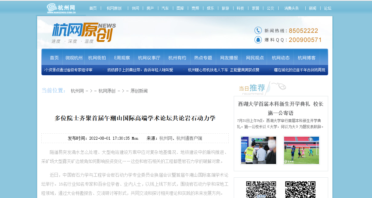 杭州网:多位院士齐聚首届午潮山国际高端学术论坛共论岩石动力学