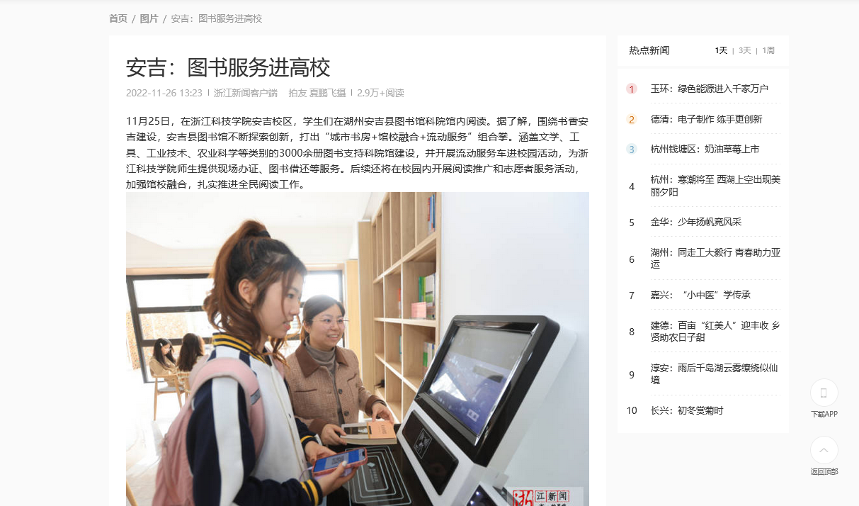 11月25日,在浙江科技学院安吉校区,学生们在湖州安吉县图书馆科院馆内阅读。据了解,围绕书香安吉建设,安吉县图书馆不断探索创新,打出“城市书房+馆校融合+流动服务”组合拳。涵盖文学、工具、工业技术、农业科学等类别的3000余册图书支持科院馆建设,并开展流动服务车进校园活动,为浙江科技学院师生提供现场办证、图书借还等服务。后续还将在校园内开展阅读推广和志愿者服务活动,加强馆校融合,扎实推进全民阅读工作。