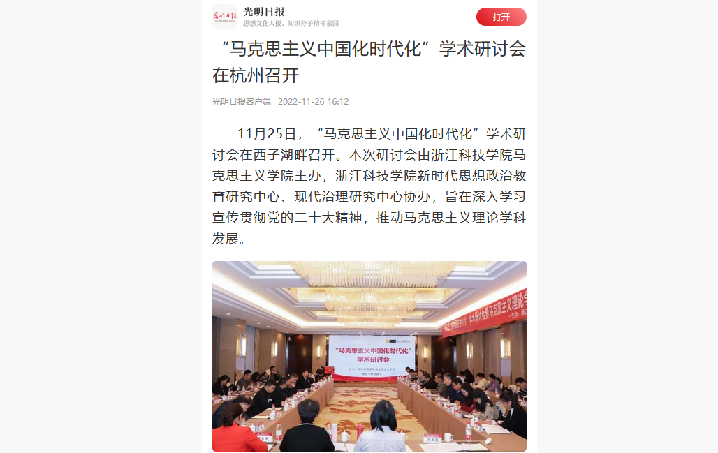 11月25日,“马克思主义中国化时代化”学术研讨会在西子湖畔召开。本次研讨会由浙江科技学院马克思主义学院主办,浙江科技学院新时代思想政治教育研究中心、现代治理研究中心协办,旨在深入学习宣传贯彻党的二十大精神,推动马克思主义理论学科发展。光明日报客户端、小时新闻等媒体对研讨会进行了报道。