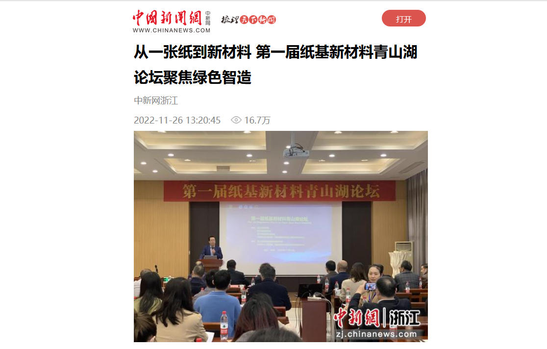 11月25日,第一届纸基新材料青山湖论坛在杭州临安举行,此次论坛聚焦“纸基新材料研发与绿色智造”,业内专家学者分享纸基新材料领域的前沿动态及最新研究成果,共同研讨纸基新材料的研究进展、应用前景及创新发展方向。中国新闻网、杭州网等媒体对论坛进行了报道。