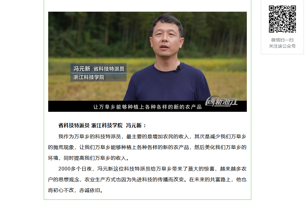 4月15日,浙江经视《创新浙江》栏目、浙江省科学技术厅微信公众号“创新浙江”发布《科技筑起山区共富梦 浙江省科技特派员制度实施20周年系列一》的报道。报道中关注了我校科技特派员冯元新在万阜乡,为实现产业兴、农村美、农民富奉献着自己的智慧和汗水。