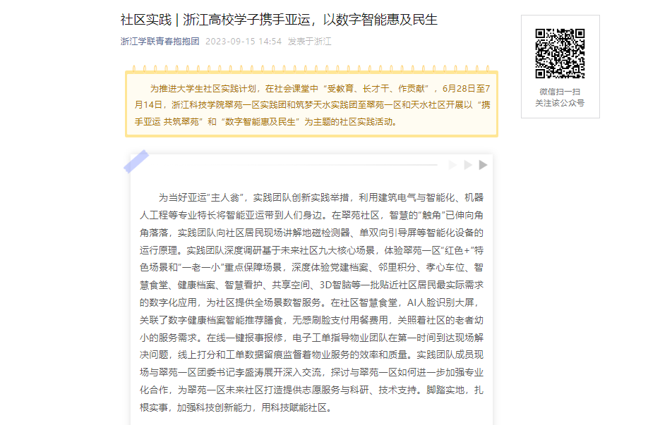 为推进大学生社区实践计划,在社会课堂中“受教育、长才干、作贡献”,6月28日至7月14日,浙江科技学院翠苑一区实践团和筑梦天水实践团至翠苑一区和天水社区开展以“携手亚运 共筑翠苑”和“数字智能惠及民生”为主题的社区实践活动。
