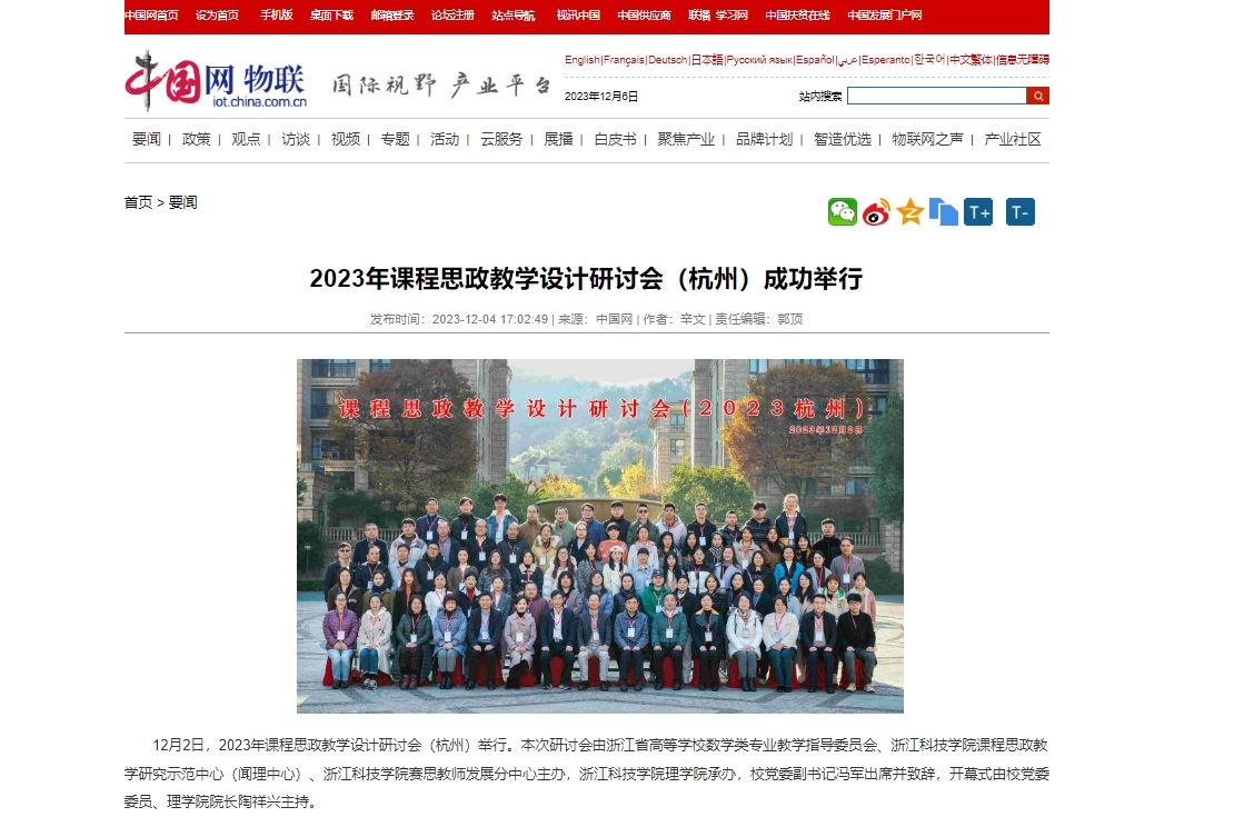 近日,由我校和浙江省高等学校数学类专业教学指导委员会主办、理学院承办的2023年课程思政教学设计研讨会(杭州)举行,中国网、新浪网、凤凰网等媒体对会议进行了报道。