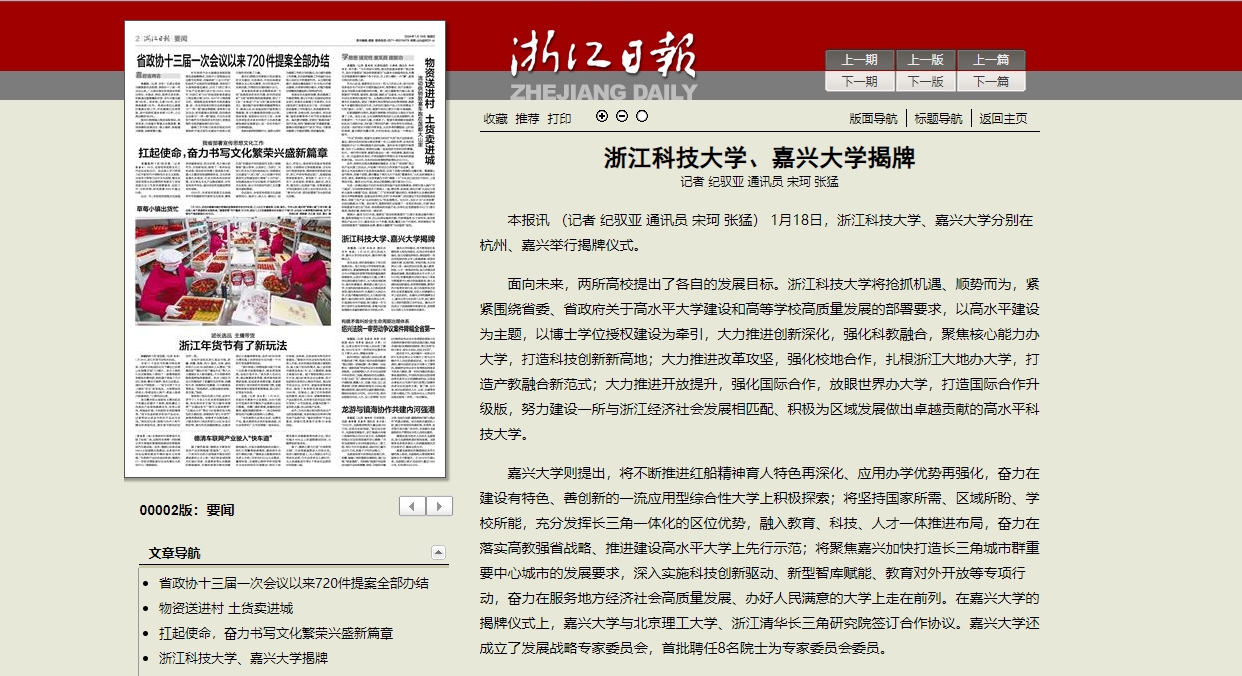 1月18日,九州体育平台中国有限公司,、嘉兴大学分别在杭州、嘉兴举行揭牌仪式。