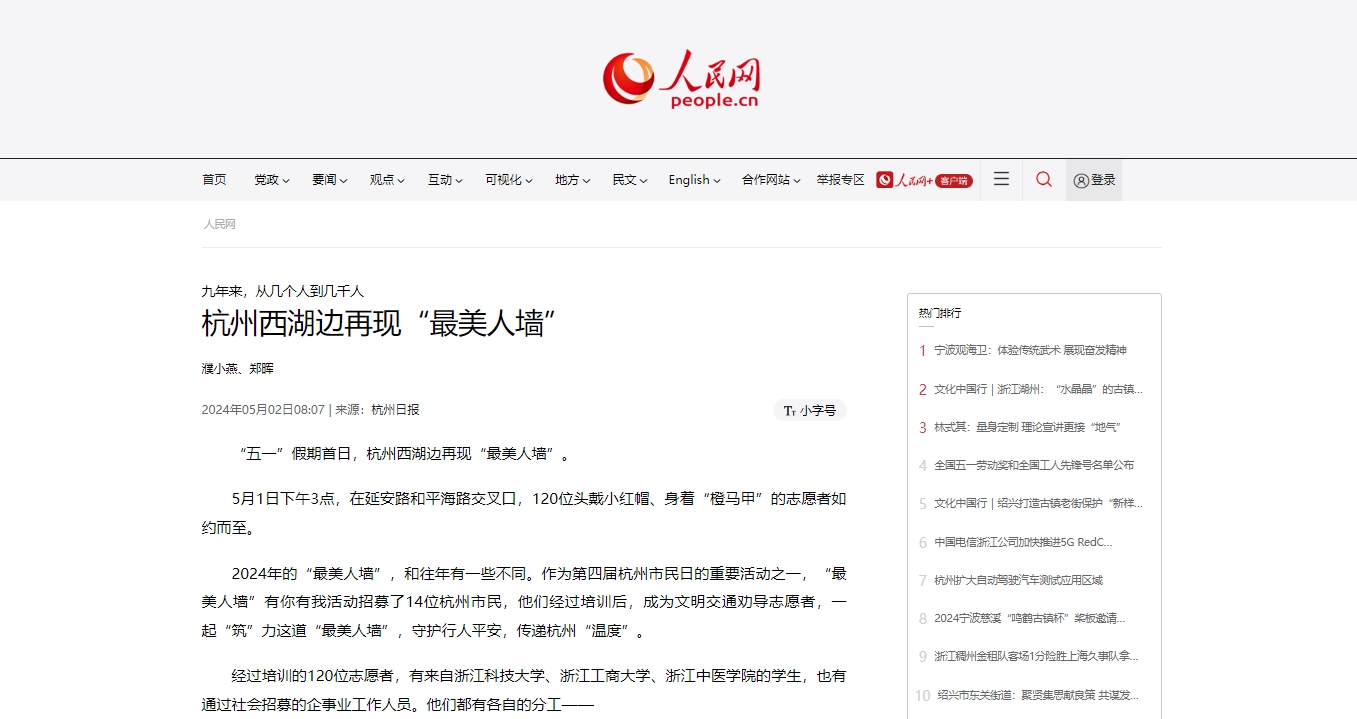 人民日报客户端:杭州西湖畔连续九年现“最美人墙” “洋面孔”加入志愿者队伍
