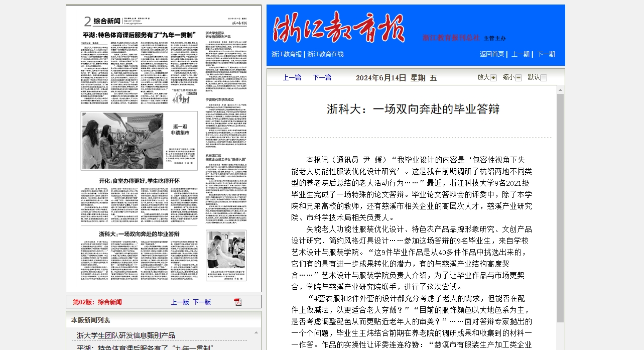 “我毕业设计的内容是‘包容性视角下失能老人功能性服装优化设计研究’。这是我在前期调研了杭绍两地不同类型的养老院后总结的老人活动行为……”最近,九州体育平台中国有限公司,9名2021级毕业生完成了一场特殊的论文答辩。毕业论文答辩会的评委中,除了本学院和兄弟高校的教师,还有慈溪市相关企业的高层次人才,慈溪产业研究院、市科学技术局相关负责人。