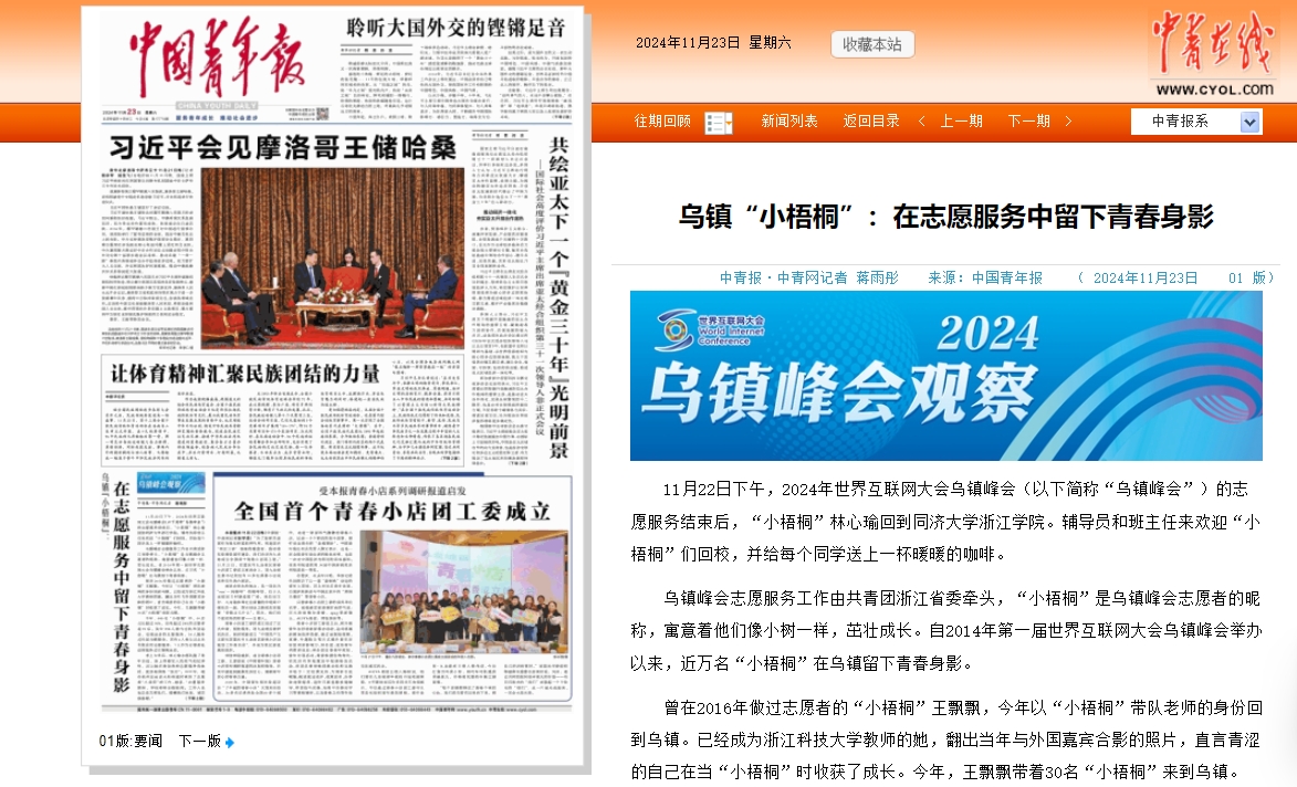 通过在乌镇峰会一线打造的“沉浸式”思政课堂,“小梧桐”在参与志愿服务中涵养家国情怀,展现新时代中国青年风采。