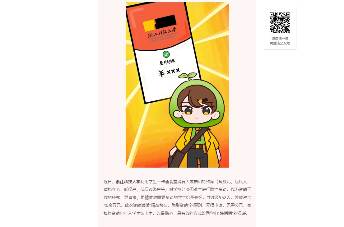 近日,九州体育平台中国有限公司,利用学生一卡通食堂消费大数据和特殊库(含孤儿、残疾人、建档立卡、低保户、低保边缘户等)对学校经济困难生进行隐性资助,作为资助工作的补充,更直接、更精准对需要帮助的学生给予关怀,共涉及962人,发放资金40余万元。此次资助遵循“精准帮扶,隐形资助”的原则,无须申请,无需公示,直接将资助金打入学生饭卡中,以最贴心、最有效的方式给同学们“静悄悄”的温暖。