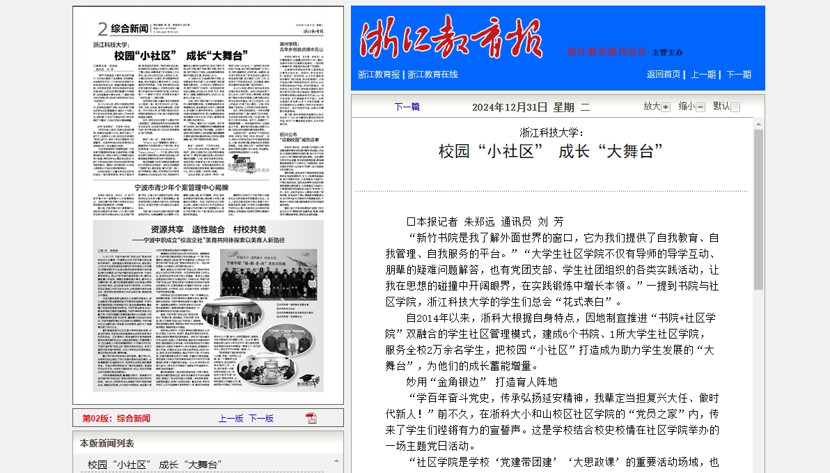 自2014年以来,浙科大根据自身特点,因地制宜推进“书院+社区学院”双融合的学生社区管理模式,建成6个书院、1所大学生社区学院,服务全校2万余名学生,把校园“小社区”打造成为助力学生发展的“大舞台”,为他们的成长蓄能增量。