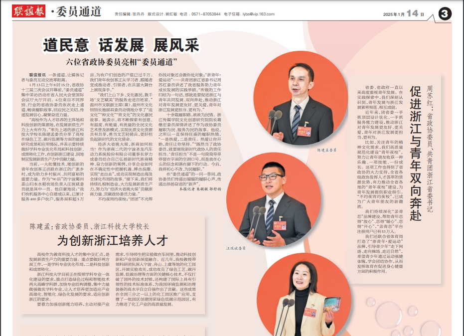 不约夜宵约夜校;“团团”不光帮你找对象还会教你处对象;“浙青年·爱运动”……共青团浙江省委书记周苏红委员讲述了我省服务助力青年成长发展的实践举措,“所做的工作归结为一句话,那就是要促进浙江与青年共同发展、双向奔赴,推动浙江对青年发展更友好、更关爱,青年对浙江发展更担当、更有为。”