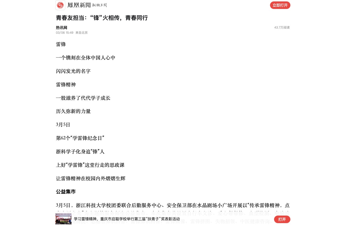 3月5日,第62个“学雷锋纪念日”,浙科学子化身追“锋”人,上好“学雷锋”这堂行走的思政课,让雷锋精神在校园内外熠熠生辉。