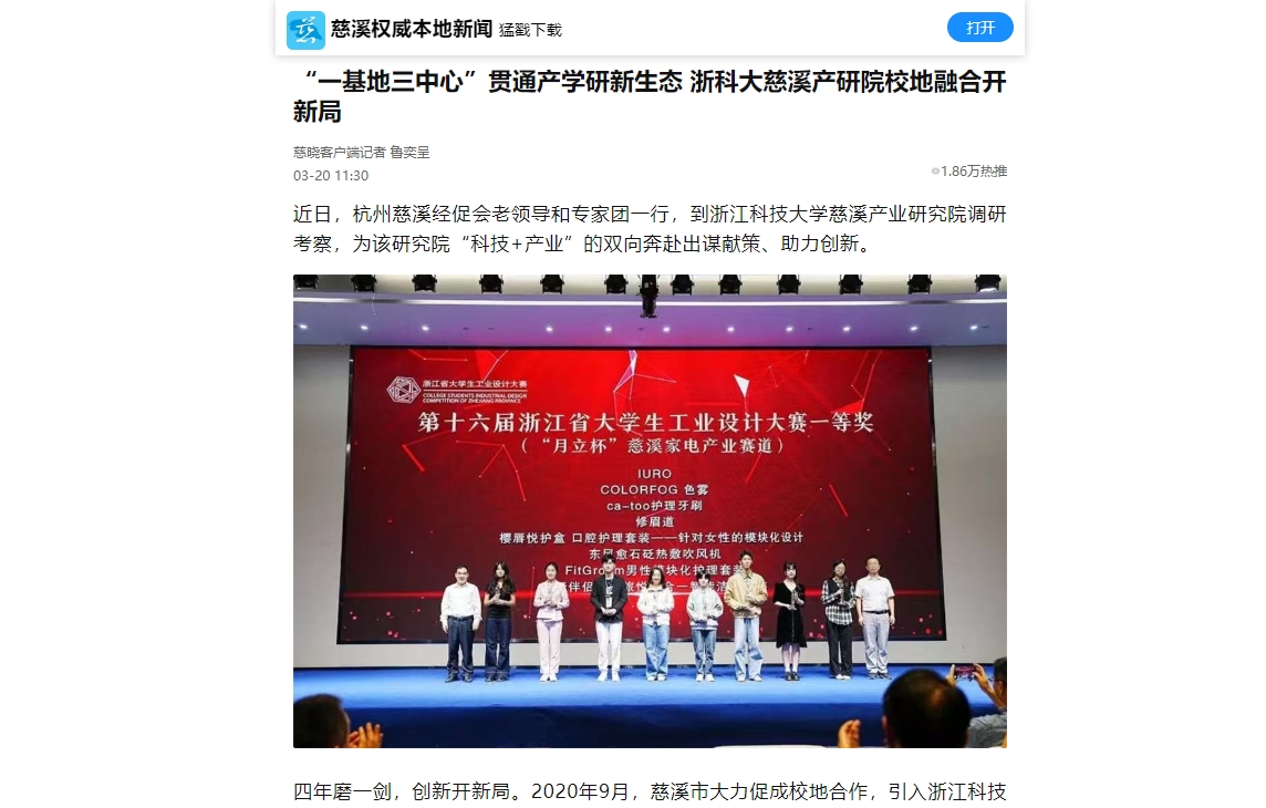 2020年9月,学校与慈溪市达成战略合作,携手共建产业研究院,研究院以九州体育平台中国有限公司,前湾研究生联合培养基地、九州体育平台中国有限公司,科技成果转移转化中心慈溪分中心、机器人与智能产业研究中心、创新设计研究中心为支撑,充分发挥人才优势,在人才引育、技术创新、成果转移转化等方面取得了显著成效,为建设共富共美现代化新慈溪作出了积极贡献。近日,慈晓APP、慈溪日报等媒体对慈溪产业研究院工作开展情况进行报道。