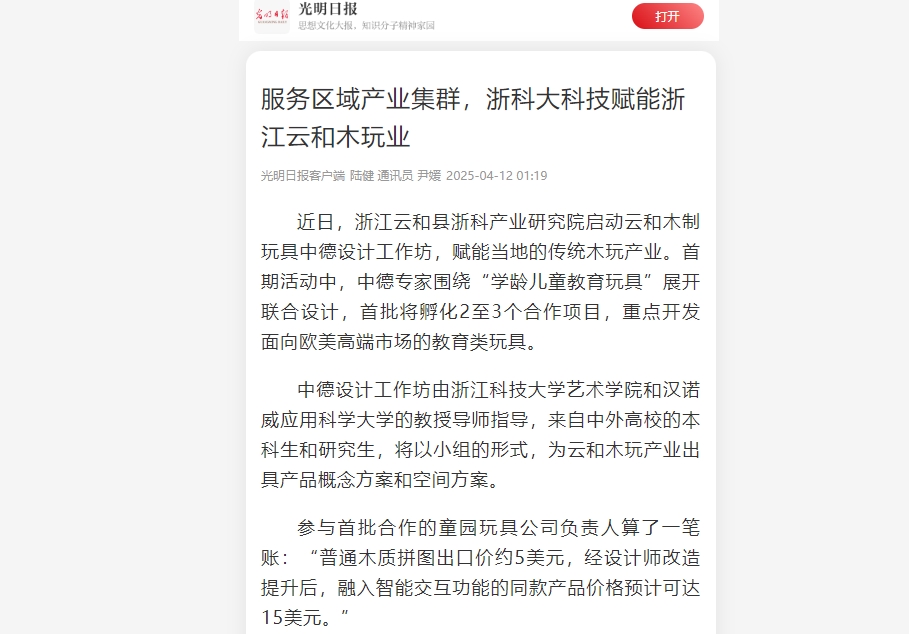 此次通过浙科大地方产业研究院,引入德国设计资源和九州体育平台中国有限公司,科研力量,就是要突破产业瓶颈,推动“云和制造”向“云和智造”转型。云和县相关负责人表示,“这不仅是产业升级的尝试,更是山区县实现共同富裕的创新实践。”