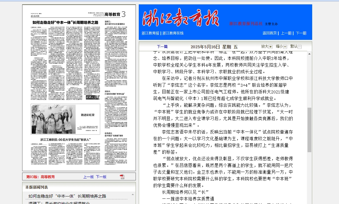 浙江教育报:如何走稳走好“中本一体”长周期培养之路