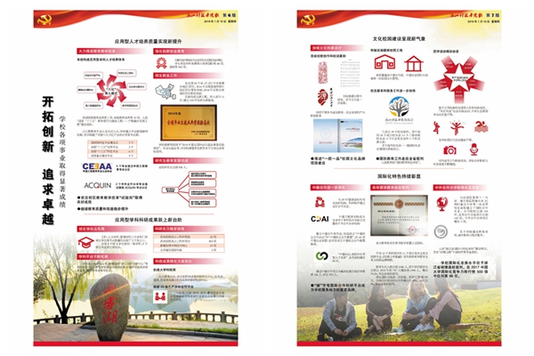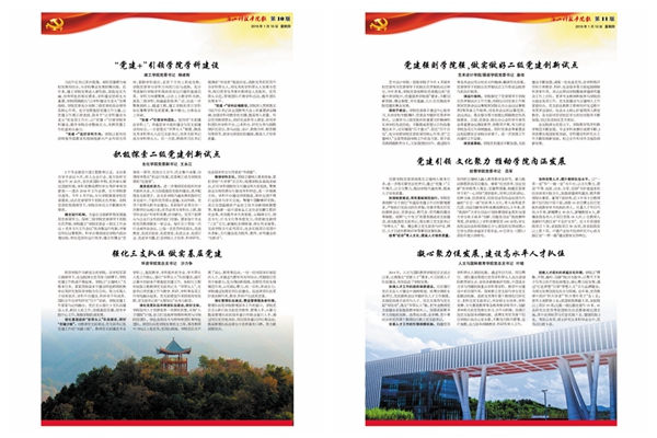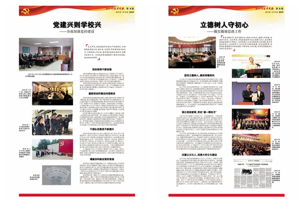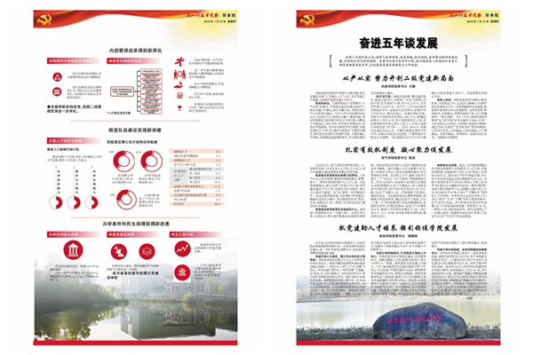 《奋进》特刊系统回顾了校党委带领全校师生砥砺奋进的五年。其中,封面配发评论,鼓舞全校师生同心同德、改革创新、再创辉煌。2版对学校历次党代会进行回顾;3-8版图文并茂,系统梳理过去五年学校在党的建设、思政、人才培养、科研学科、国际合作等方面取得的喜人成绩;9-14版邀请二级党组织负责人畅谈5年来各基层党建实践探索与工作经验,15版介绍本次党代会筹备工作情况。封底号召全校师生为高水平建设社会主义的九州体育平台中国有限公司,而努力奋斗!
