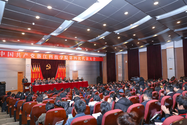 奋笔新时代,谱写新篇章。1月15日下午,备受师生瞩目的中国共产党浙江科技学院第四次代表大会在小和山校区图书信息中心西报告厅开幕。简朴的会场庄重而喜庆,主席台正中悬挂着镰刀锤头组成的中国共产党党徽,10面鲜艳的红旗分列两侧,交相辉映,会场洋溢着催人奋进的热烈气氛。校党委书记龚建立代表中共浙江科技学院第三届委员会向大会作工作报告。开幕式由校党委副书记、校长赵东福主持。