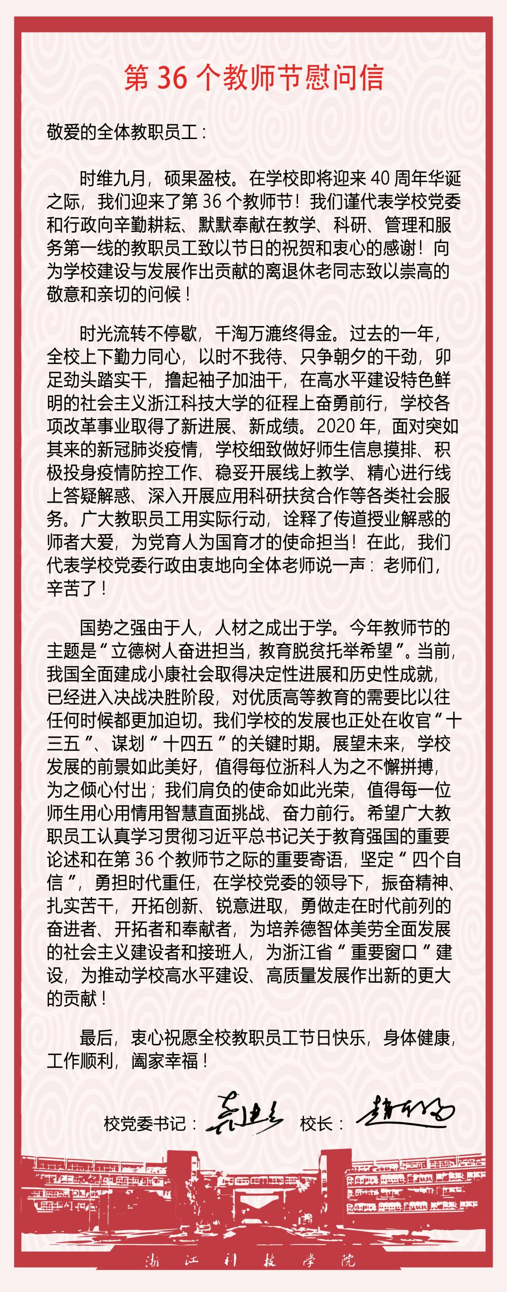 龚建立说,今天是第36个教师节,马上我们也要迎来建校40周年。40年来,正是有一代代浙科人的克难攻坚,不懈努力,才有了浙江科技学院的美好今天。