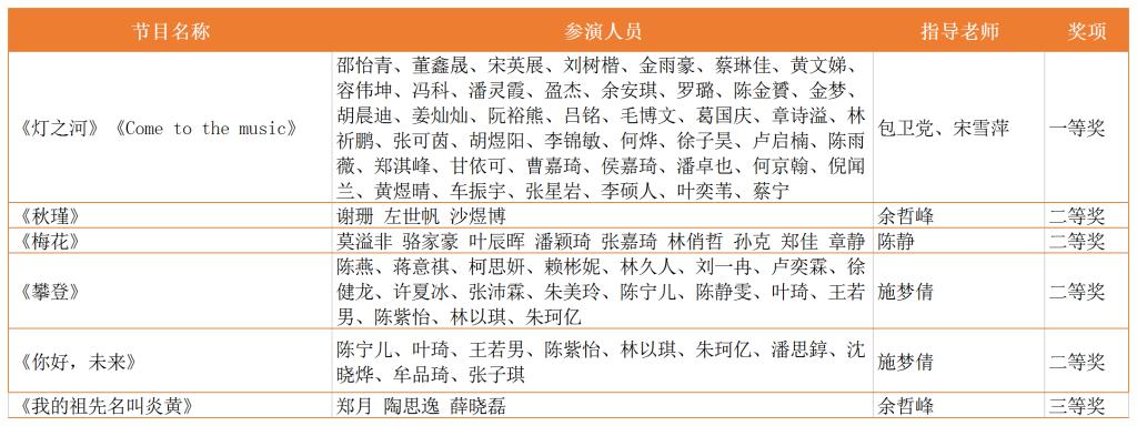 今年,大学生艺术节以“民族魂·中国梦”为主题,全省有88所高校选送了声乐、器乐、舞蹈、戏剧、朗诵和校园十佳歌手共601个节目,最终有168个节目入围现场展演,《灯之河》《Come to the music》获大合唱组一等奖,朗诵作品《秋瑾》、器乐作品《梅花》、舞蹈作品《你好,未来》《攀登》获二等奖,朗诵作品《我的祖先名叫炎黄》获得三等奖。(获奖名单详见下表)。