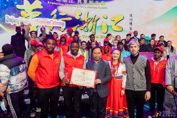 12月11日晚,第十四届“梦行浙江”外国留学生中华才艺展演在浙江传媒学院举行。浙江省人民政府副省长成岳冲、浙江省教育厅厅长陈根芳等领导出席活动,我校校长赵东福应邀出席。我校留学生团队表演的音乐剧《和浙梦一起飞》,博得在场观众的一致好评。本届“梦行浙江”系列活动还纳入了“美丽浙江”短视频大赛,我校来自科特迪瓦籍留学生 Kouassi Joshua Caleb Micah等同学的《读竹乡安吉,品绿水青山》(指导老师:李建瑜、华天奕、王飘飘),乌克兰籍留学生 Limarev Kyrylo等同学的《和浙梦一起飞》(指导老师:王飘飘)均获“美丽浙江”短视频大赛三等奖。
