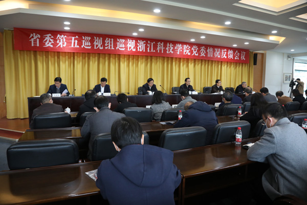 2021年3月3日上午,省委第五巡视组向浙江科技学院党委反馈巡视情况。省委组织部副部长胡旭阳出席向浙江科技学院党委书记龚建立的反馈会议,出席向浙江科技学院党委领导班子反馈会议,对巡视整改提出要求。会议向龚建立传达了省委书记专题会议精神,省委第五巡视组组长万亚伟代表省委巡视组分别向龚建立和领导班子反馈了巡视情况。省教育厅党委副书记干武东参加反馈会议并就抓好浙江科技学院党委巡视整改工作提出要求。龚建立主持领导班子反馈会议并作表态讲话。