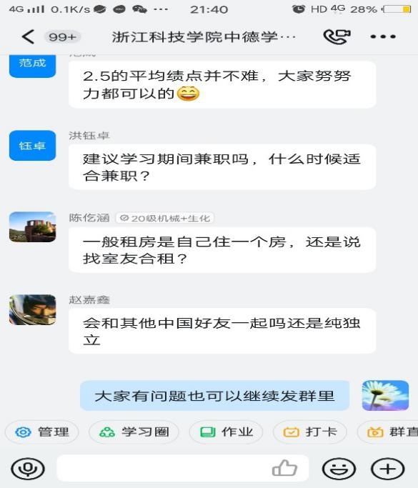 3次活动中,“2+3”项目毕业生范成、徐同禹、邢鑫分享自己申请德国慕尼黑工业大学、斯图加特大学、布伦瑞克工业大学硕士学位的经历和读硕的体会;施素素分享自己获德国DAAD外国留学生奖学金的经验;2018级德福考试高分考生陈张婷、陈羽寒、李夏晴分享自己的备考经验;2017级德语专业陈子轩、季畅宇,分别介绍自己考取浙江大学、上海外国语大学硕士研究生的经验,在钉钉直播间参活动的同学,围绕自己关注的重点,面临的困难、困惑等具体问题跟学长学姐们进行虚心请教和深入交流。