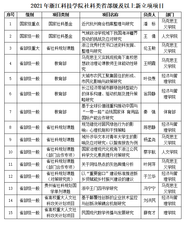 学校高度重视人文社科研究工作,大力加强人文社科研究的规划和部署,加强组织化管理,坚持问题导向,着力为浙江地方经济社会发展服务,科研立项和成果数量稳步增加。截止9月26日,学校社科类项目立项获2项国家社科基金项目,13项省部级项目(详见下表),其他项目正在有序评审中。(科研处、社会合作办 赵昕丽)