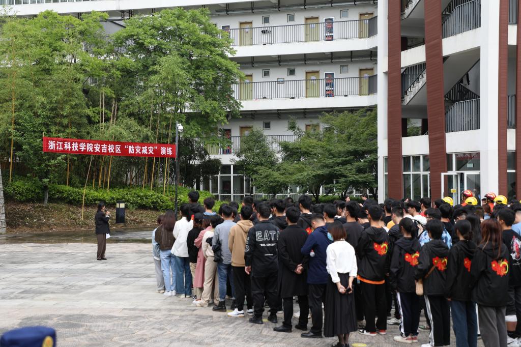 活动现场邀请杭州市专业消防培训机构以及安吉县孝源绿色家居消防救援站为两校区师生传授应急情况如何逃生和应急器具的使用。随后组织师生在图书馆、学生宿舍进行火灾疏散逃生演练。两校区共300余名师生参加了此次演练,整个演练过程井然有序,达到预期效果。