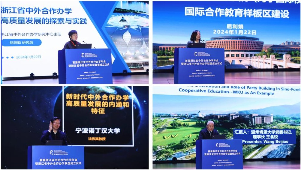 年会上,浙江省中外合作办学研究中心、浙江大学、宁波诺丁汉大学、温州肯恩大学作大会主旨报告,浙江工商大学、杭州电子科技大学、温州医科大学、金华职业技术学院、浙江纺织服装职业技术学院作高质量发展论坛报告。蓝晶晶作会议总结。