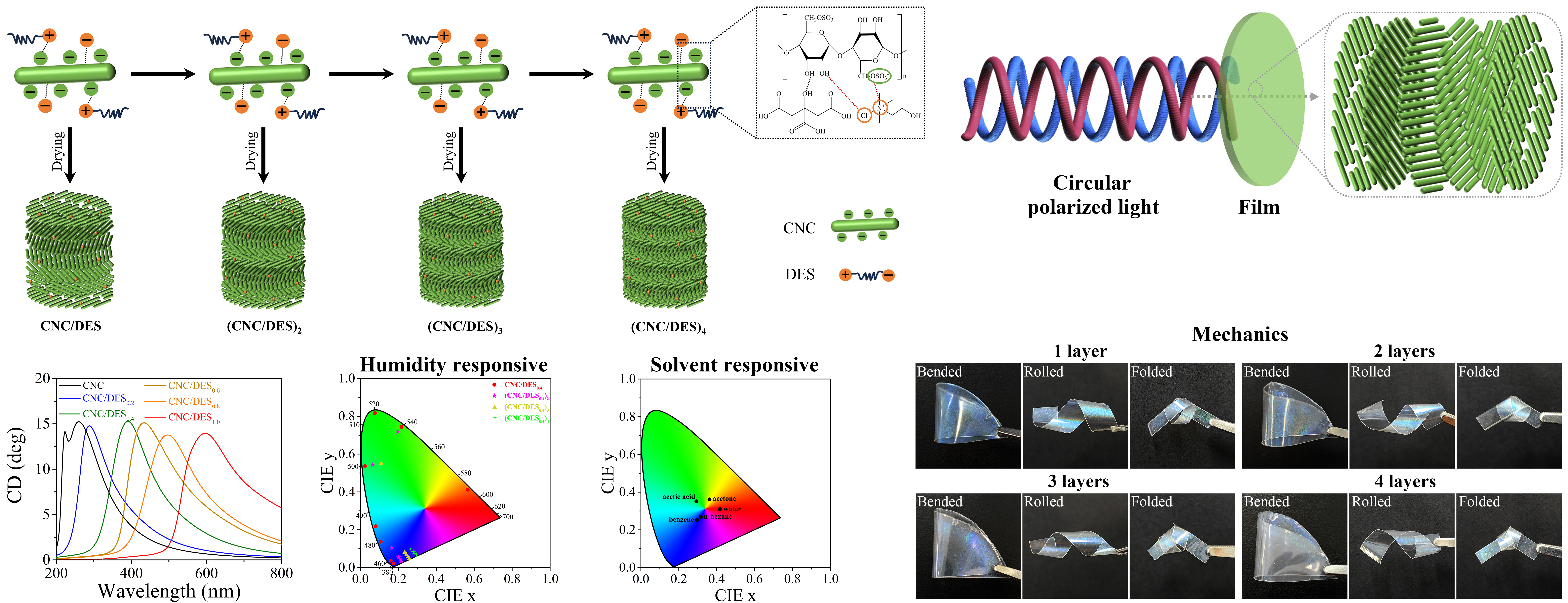 光子晶体在智能材料方面具有巨大的潜力,尤其是利用光子晶体构建具有结构色彩的材料已成为研究热点。纤维素纳米晶(CNCs)是一种天然纳米材料,具有光子晶体特性,可以通过蒸发诱导自组装形成具有手性向列结构的光子薄膜。然而,传统的CNC光子薄膜通常缺乏可调的结构颜色和柔韧性,阻碍了其实际应用。为解决上述问题,论文报道了一种具有结构颜色和力学性能可调的柔性多刺激响应光子薄膜,该膜可通过纤维素纳米晶体(CNC)和低共熔溶剂(DES)交替组装获得,不仅解决了阴阳离子对CNC自组装的影响,还能弥补CNC力学性能的不足,并且具有多角度颜色变化和溶剂辨别能力,该项工作为开发智能显示、传感器检测和防伪材料提供了一种新策略。