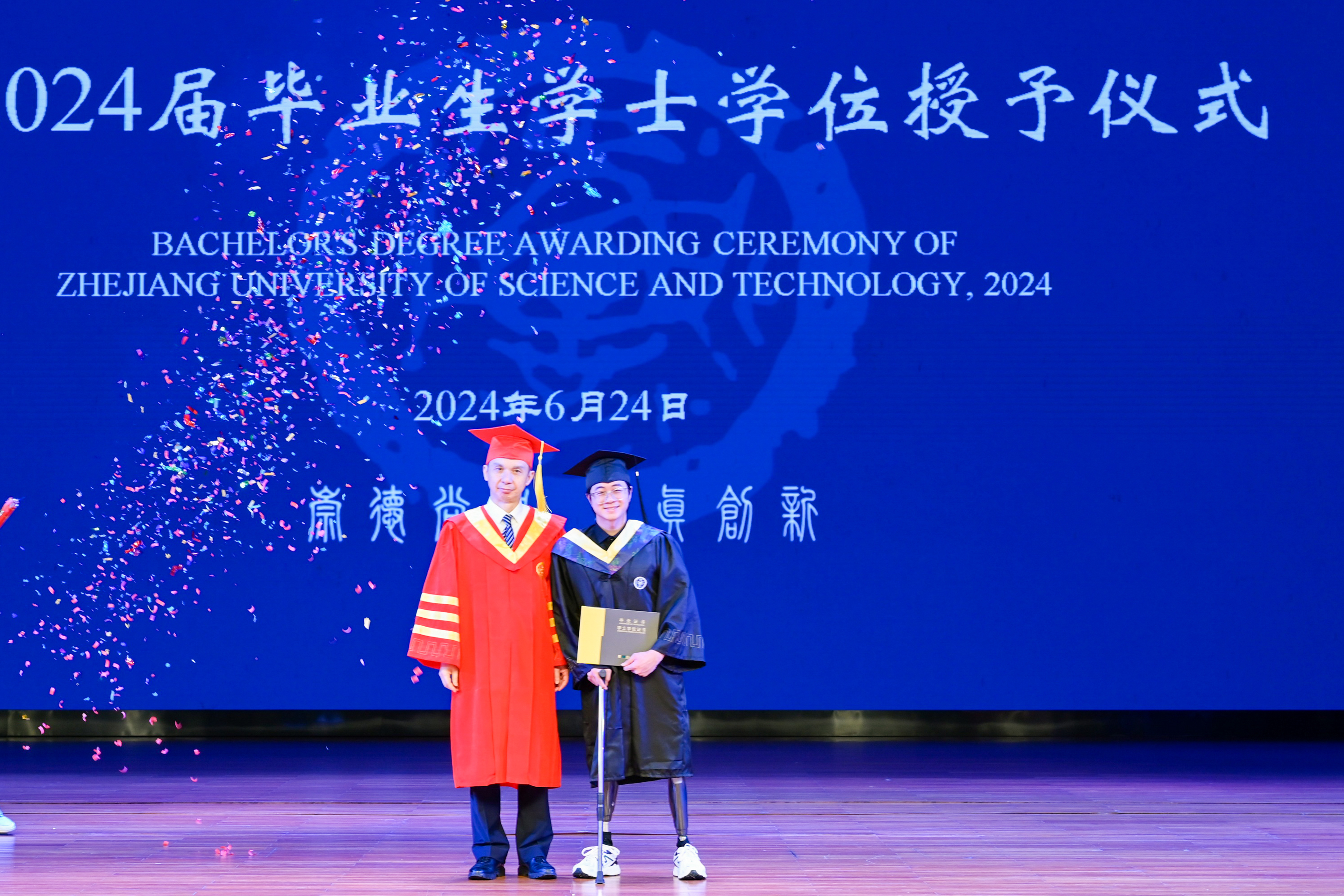 6月24日,在2024届学生毕业典礼暨学士学位授予仪式上,感动的一幕赢得了现场热烈的掌声。中国大学生自强之星、电气学院毕业生唐龙在机械腿的帮助下走上舞台,接受校长陈建孟拨穗正冠。