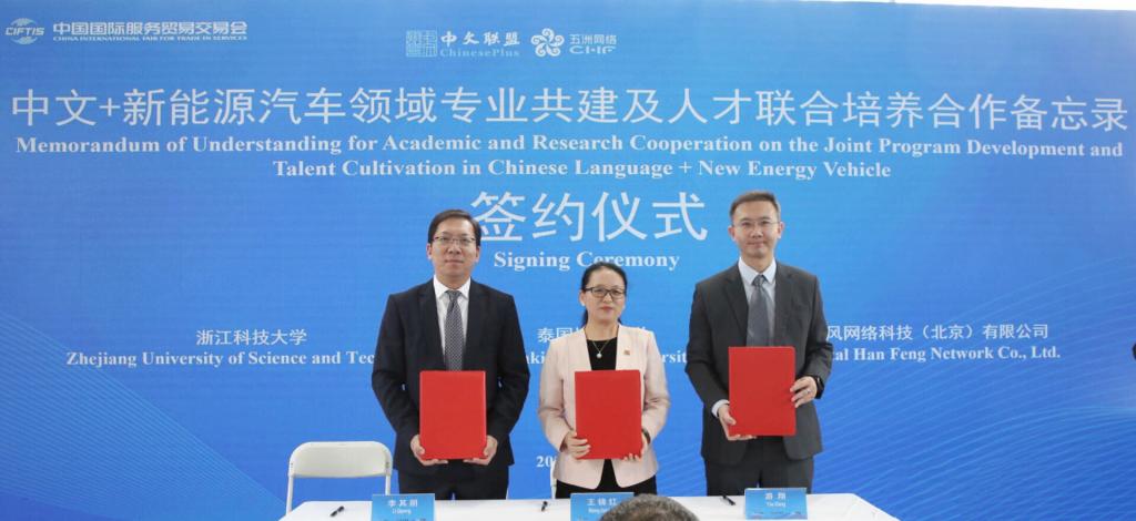 9月13日,2024年中国国际服务贸易交易会教育服务专题开幕式在北京举行,一批教育领域成果迎来集中发布和签约。副校长李其朋出席中文联盟等发起并组织的国际中文教育领域合作签约仪式,代表学校与泰国博仁大学、五洲汉风网络科技(北京)有限公司共同签署“中文+”新能源汽车领域专业共建及人才联合培养合作备忘录。国际教育学院、机械与能源工程学院相关代表共同参加签约仪式。