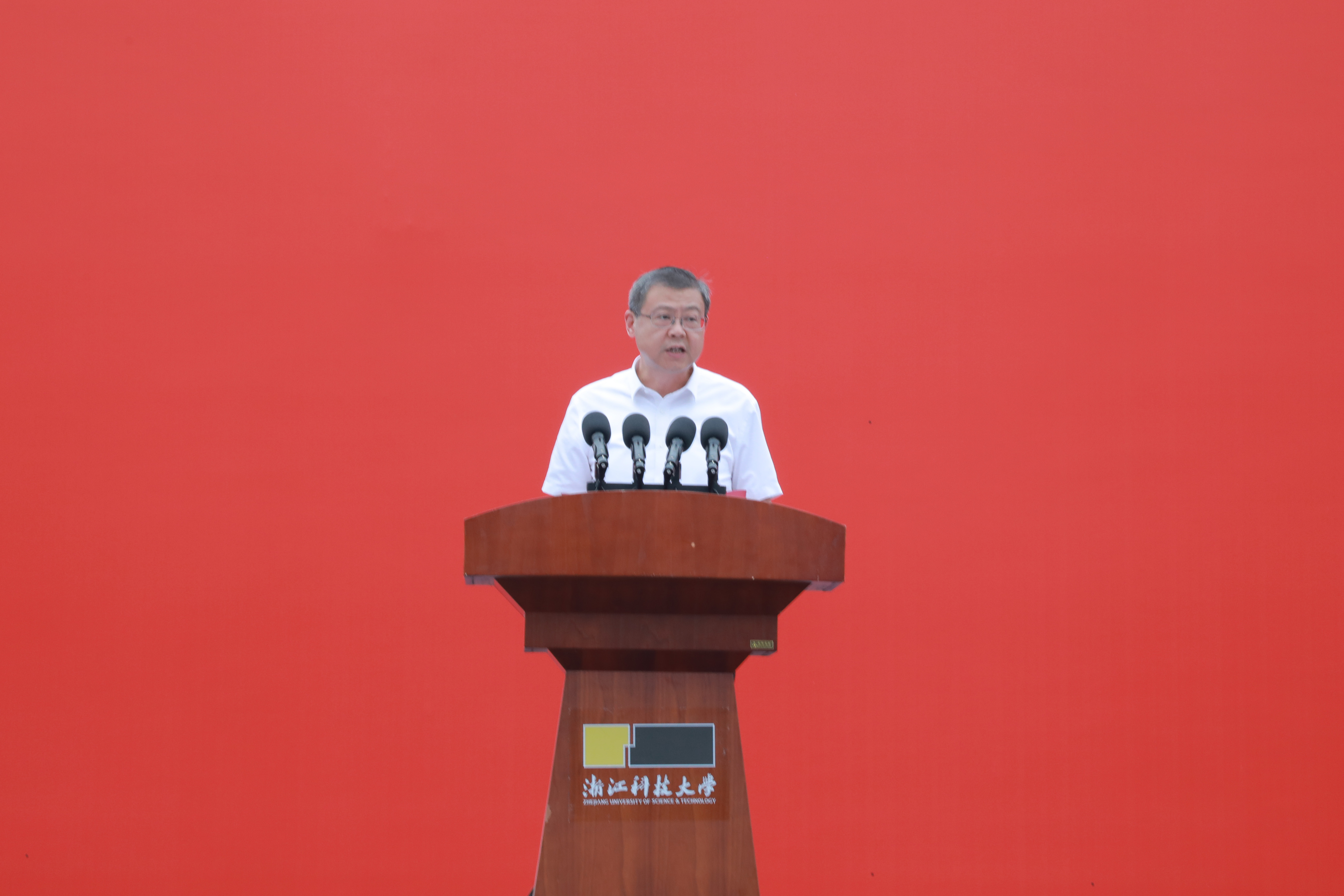 陈建孟致辞。他代表学校,向关心学校发展、支持安吉校区建设的各级政府、有关部门和各界人士表示感谢。陈建孟指出,党的二十届三中全会对统筹推进教育科技人才体制机制一体改革作出部署。省委十五届五次全会强调,要一体推进教育科技人才强省建设。我省正在以更高规格、更大力度政策,加快推进高校高水平建设。安吉校区二期工程的开工建设,是服务地方高质量发展的重要举措,也是支撑学校高水平建设的现实需要,更是深入贯彻落实中央、省委全会精神的生动实践,对于深入实施全省高校基础设施提质工程具有示范意义。陈建孟表示,学校将在安吉这片政治高地和教育热土上,以产业需求牵引学科建设,以高峰学科赋能创新发展,在“双向奔赴”中实现互融共促,奋力建设特色鲜明的高水平科技大学,争取在更高起点上为湖州、安吉经济社会高质量发展做出更大贡献。