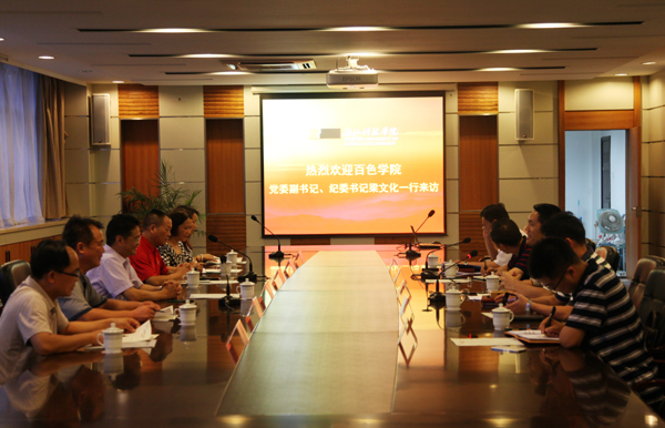 6月15日,百色学院党委副书记、纪委书记梁文化和副校长徐魁峰一行五人来校考察。校纪委书记李泽泉热情接待了来访客人。