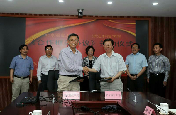 5月26日,我校与北京语言大学在京签署《合作框架协议》。王建华、北京语言大学崔希亮校长分别代表两校签约。根据协议,两校以筹建北京语言大学杭州书院为综合平台,将在本科生、研究生培养,师资队伍建设和培训,科研与学科建设,国际交流与合作等方面开展全方位合作。